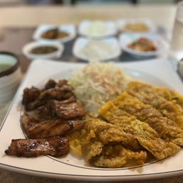 Hidden behind busy Keeamoku street is one of the family of Korean Restaurants with amazing food and tons of seating. We walked so we didn't use the parking stalls in the back of the restaurant reserved for Millions. Here's what we ordered: Mandoo: generous and overfilled pockets of pork and veggies fried to perfection. (Fun fact: their sister restaurant is located on Beretania and Punahou under the senior housing where they sell bulk mandoo frozen or made to order ) Kalbi and BBQ chicken: Cooked to perfection with a little bit of char but not enough to ruin the flavors. Meat was tender and very flavorful. Meat jhun: prepared very well with a nice piece of meat inside and the egg batter outside. The dipping sauce complimented it well. Sides: Bean sprouts, Kim Chee, cucumbers, potato salad, and spicy mochi/jello (I can hear my Korean bestie yelling at me that I am not getting the name right) all were amazing. Service: top notch. Treated us like family. So glad this restaurant is here. Now to finish dinner. It was packed tonight. Come by and keep this place open!